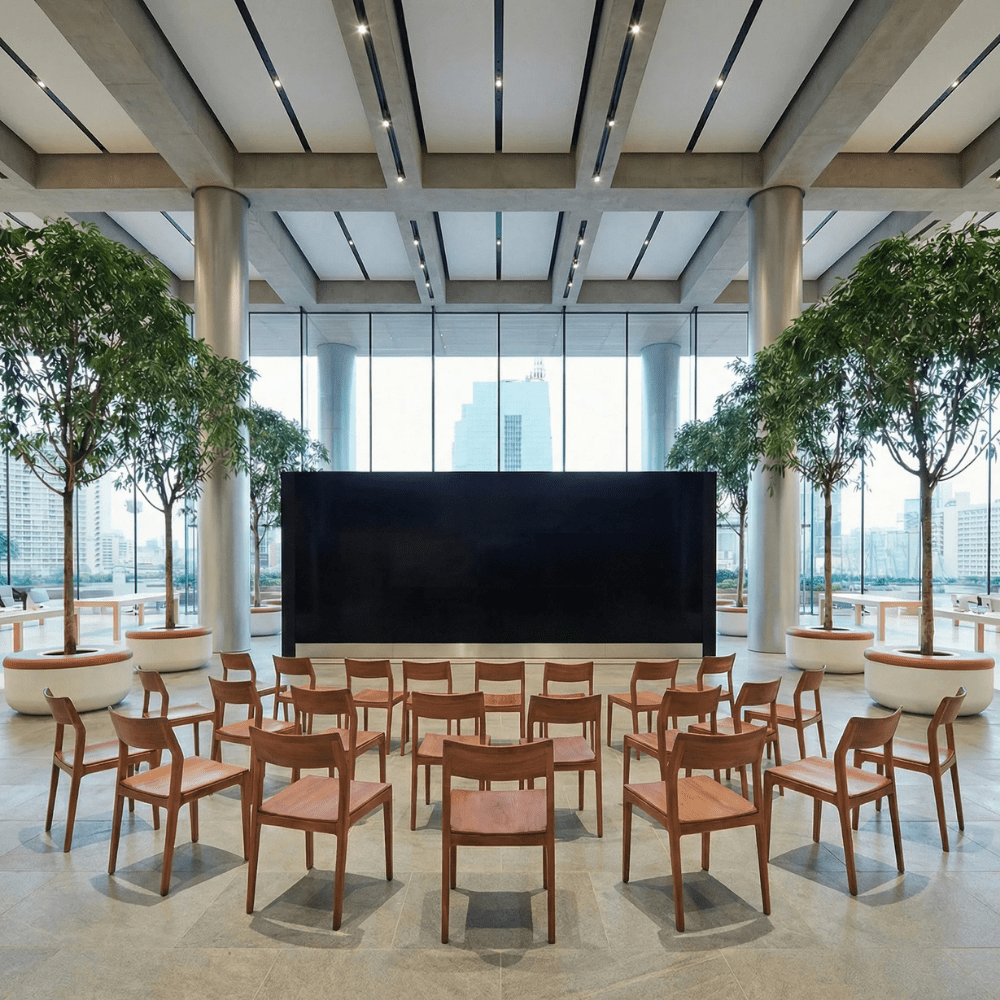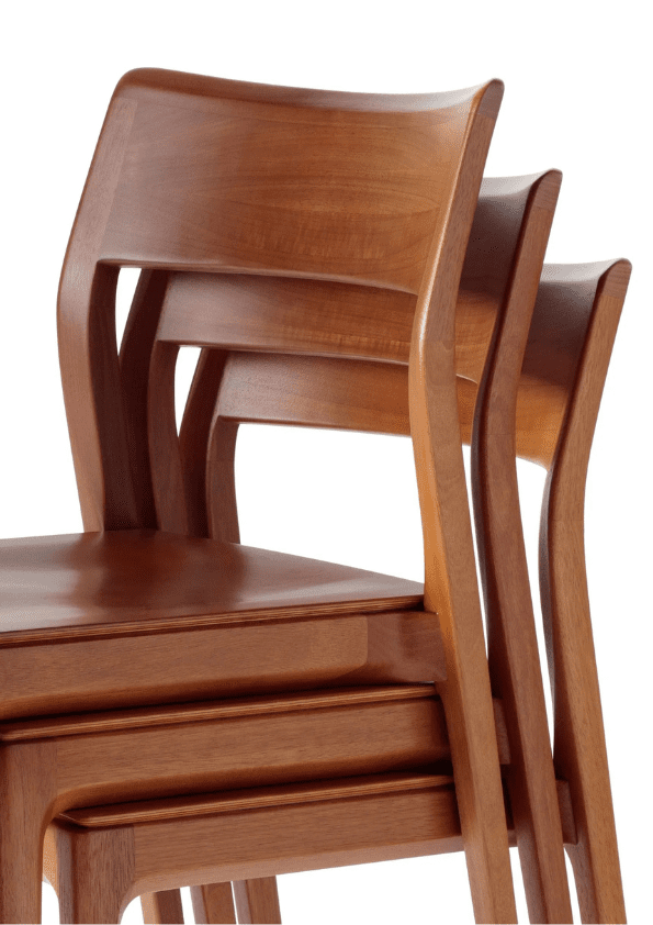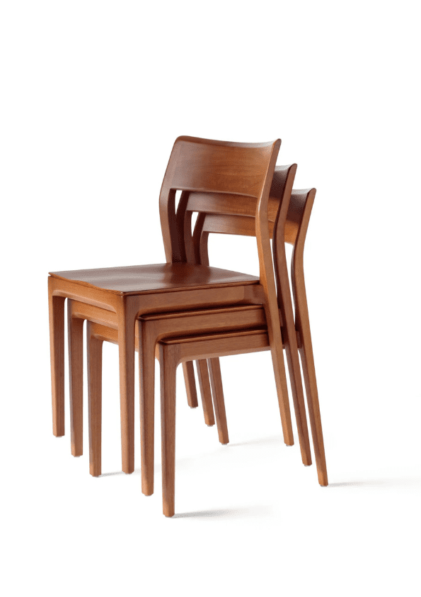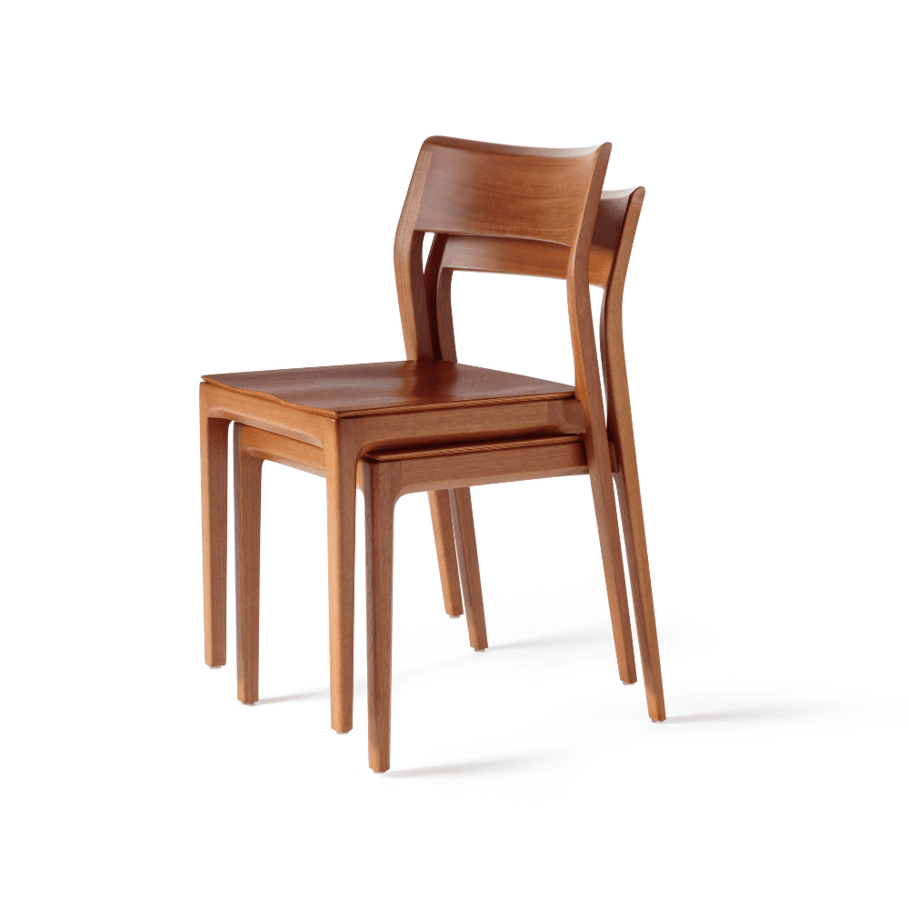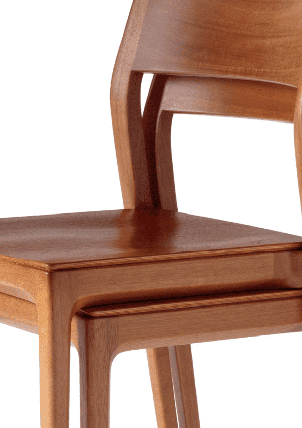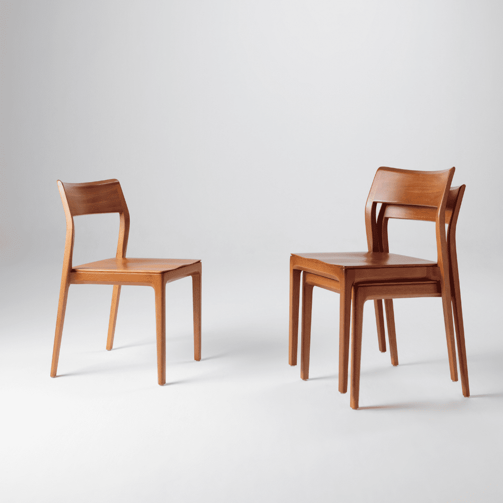 A cadeira Nina (assento maciço), de Aristeu Pires, traduz movimento e transformação. Empilhável em até 6 unidades e naturalmente fluida, acompanha a dinâmica dos ambientes com discrição e elegância, permitindo múltiplos cenários.