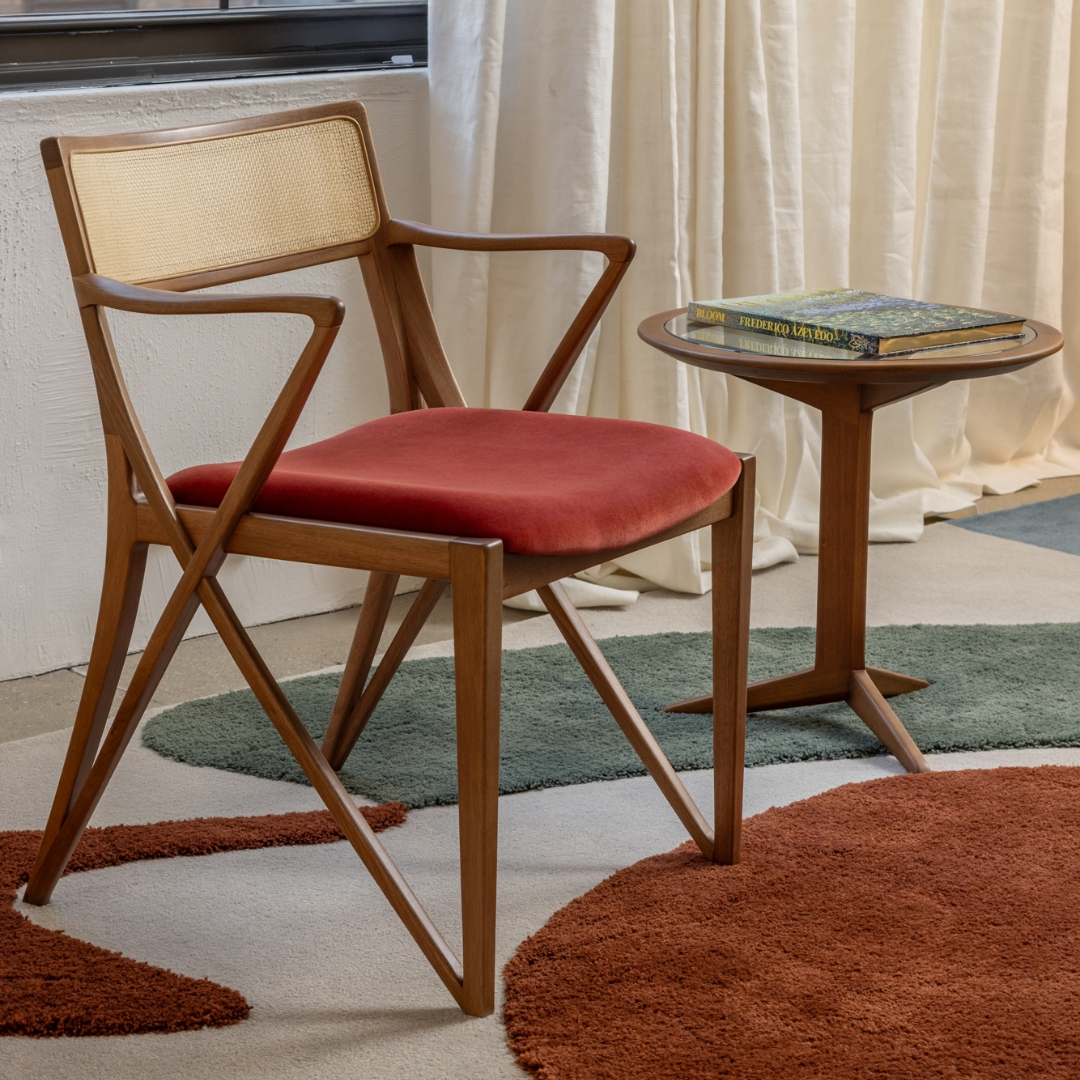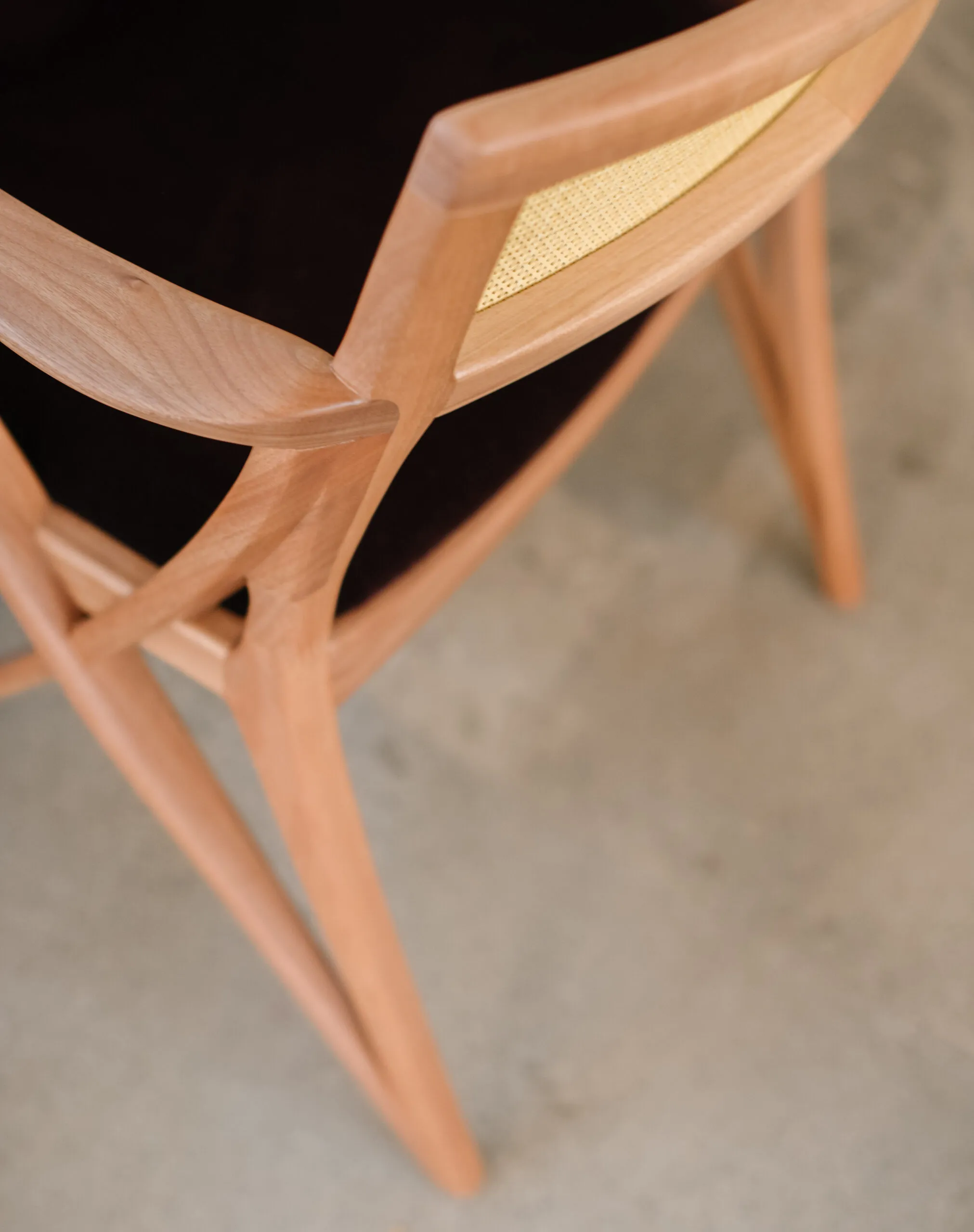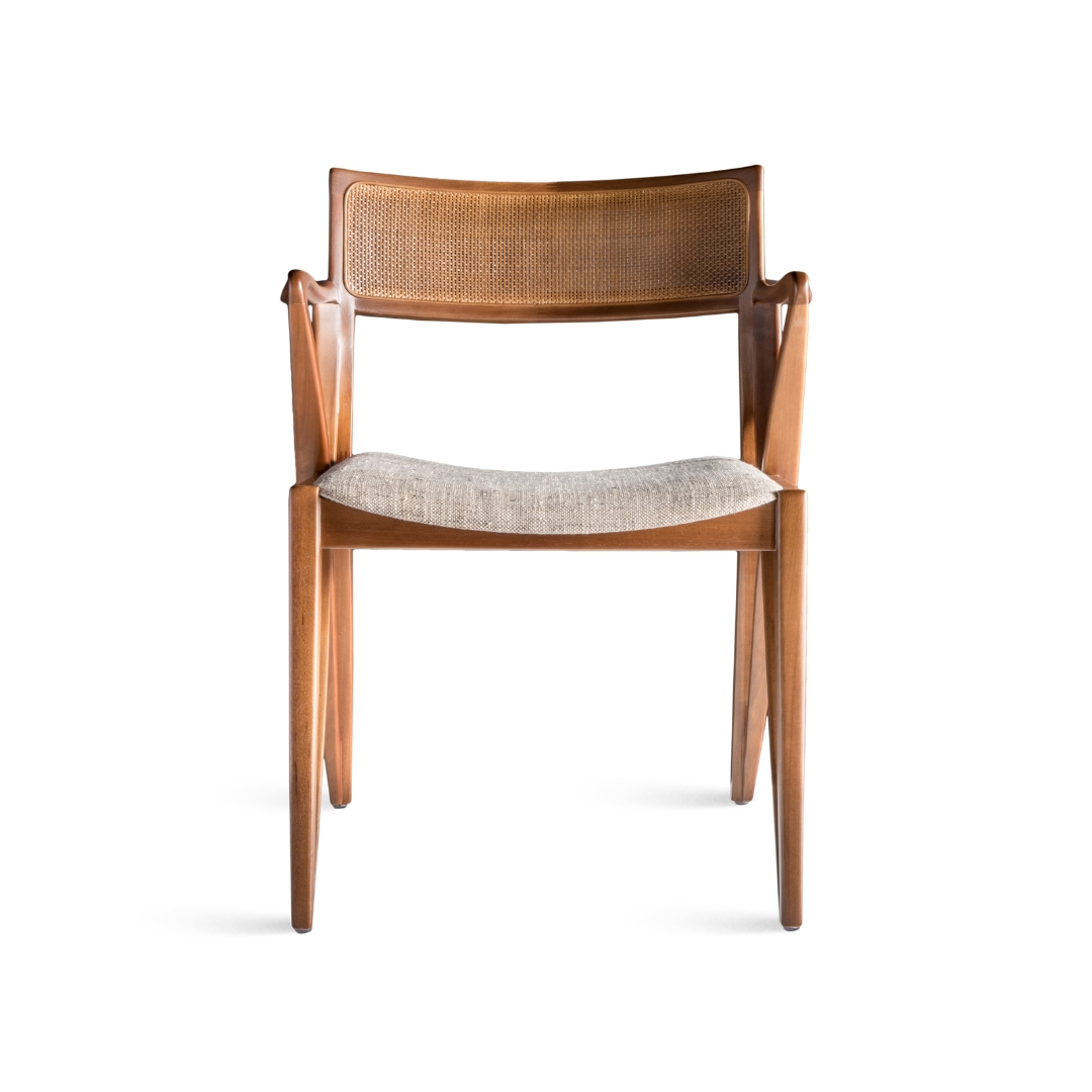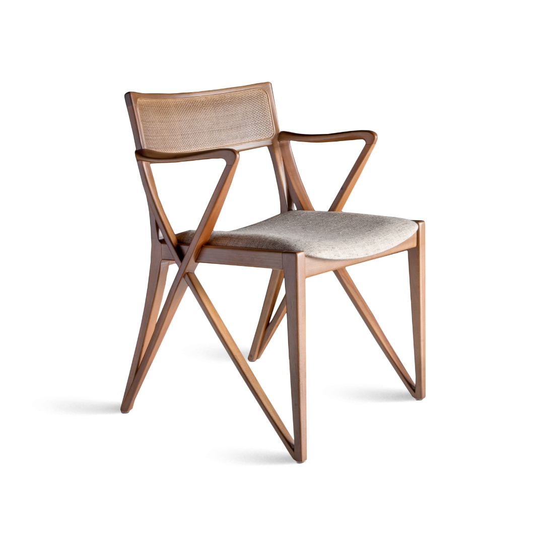 A Cadeira Olívia destaca-se pelo design sofisticado e elegante. Sua estrutura triangular inteligentemente elaborada garante robustez sem comprometer a leveza das pernas finas, sendo o design mais complexo de Aristeu Pires.