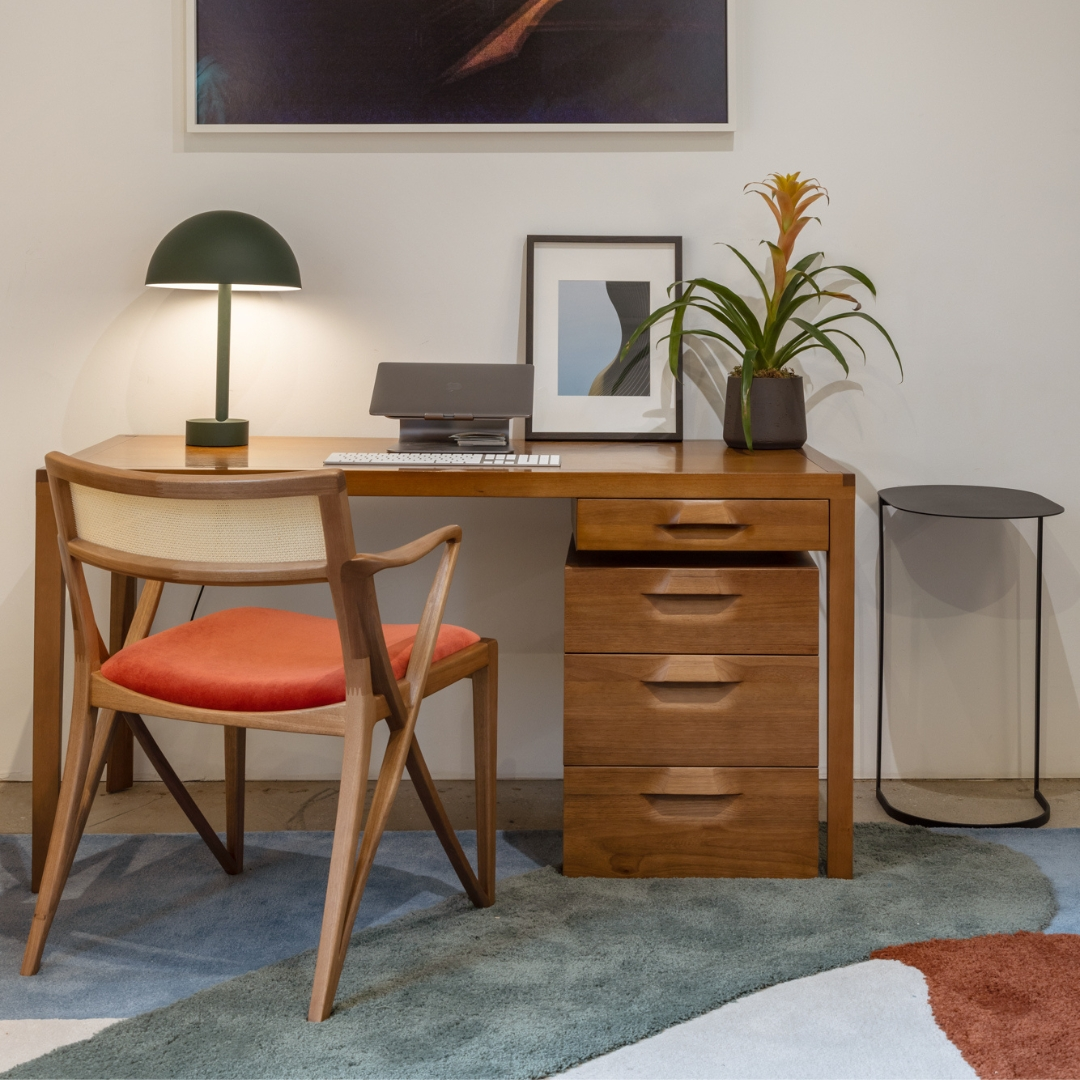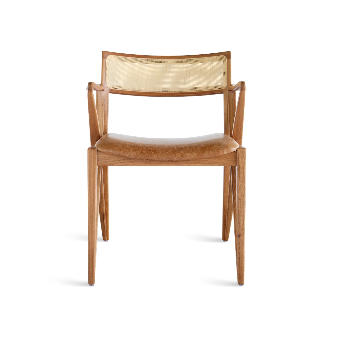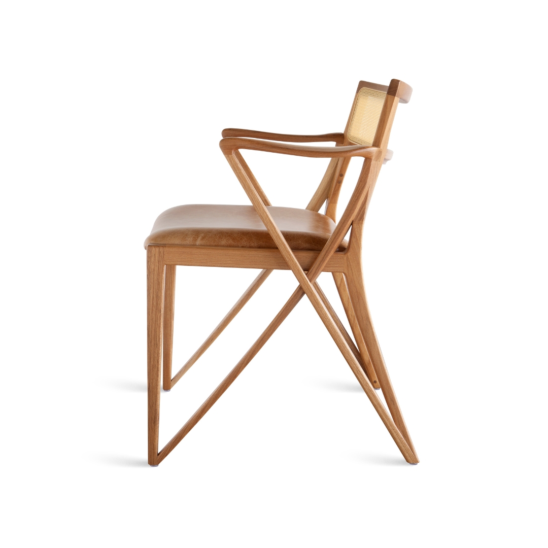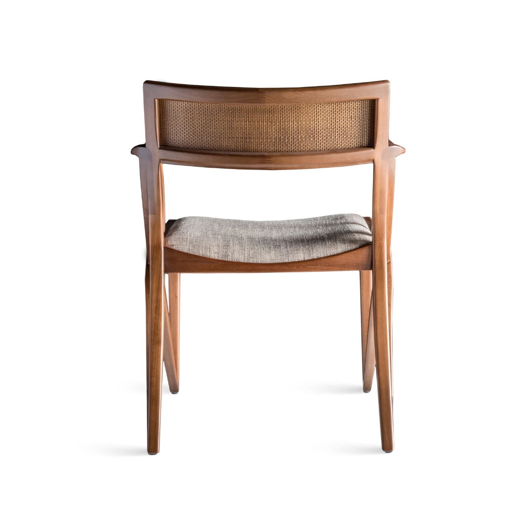 A Cadeira Olívia destaca-se pelo design sofisticado e elegante. Sua estrutura triangular inteligentemente elaborada garante robustez sem comprometer a leveza das pernas finas, sendo o design mais complexo de Aristeu Pires.