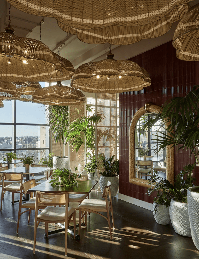 Guiada pelo lema do escritório — “luz, forma, fluxo” — a equipe incorporou luz natural abundante e vistas amplas da cidade, complementadas pela presença de vegetação e pelo uso de materiais naturais. “Adoramos como a madeira, que envelhece de uma forma bonita, faz o ambiente parecer orgânico e vívido”, afirma Shane Morris, designer que assinou interiores ao lado da sócia Rina Kujak.