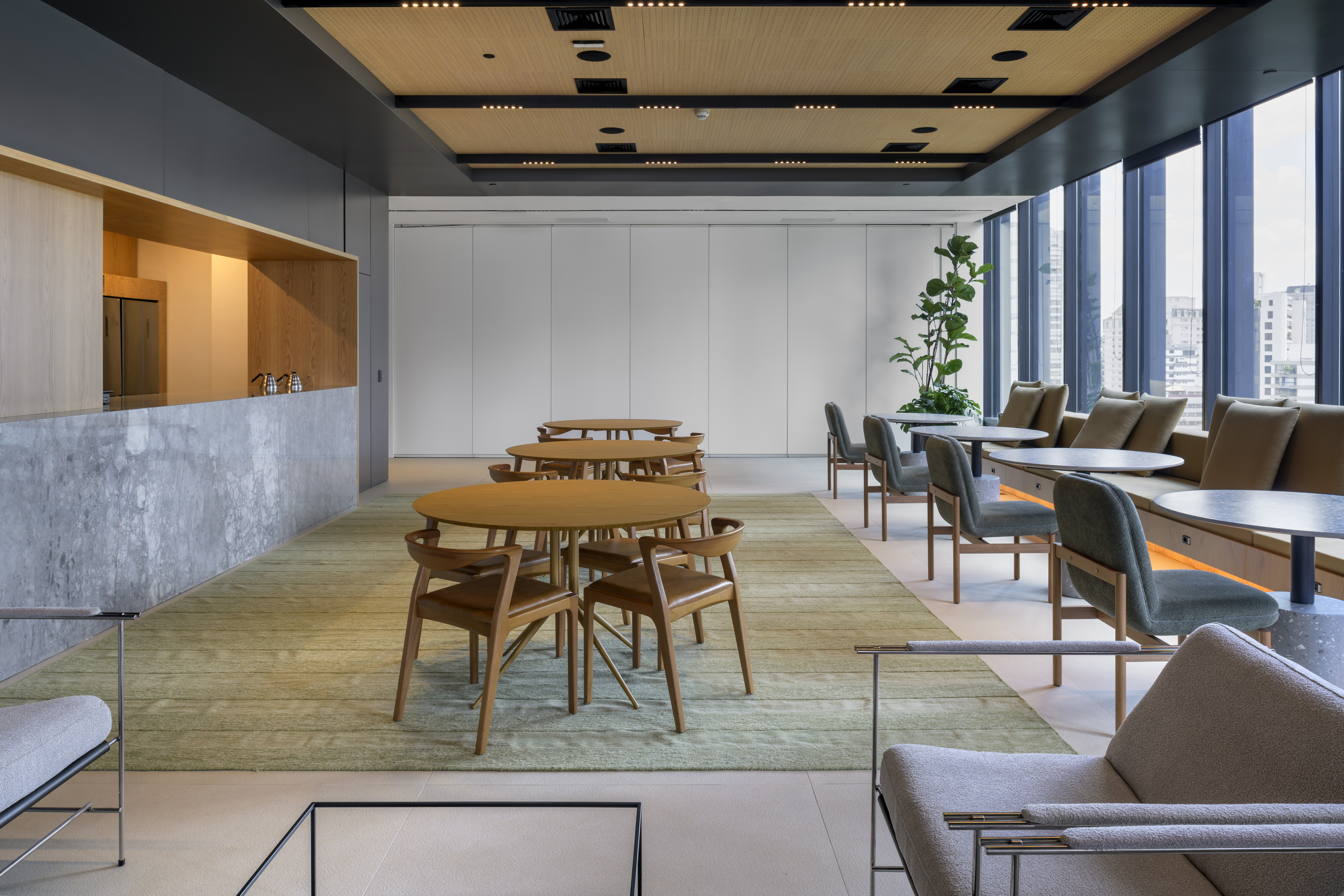 Para redefinir a experiência do cliente e inovar, o projeto dedicou um andar inteiro ao recebimento de clientes, com salas de reunião, áreas para treinamento, palestras e eventos. A grande sacada desse andar, no entanto, é o “work café”. Pensado para ser um ambiente de reunião e descompressão, o café reflete o desejo do escritório de criar uma atmosfera mais caseira, mas também sofisticada, o que levou à escolha de materiais como madeira natural e couro. Nesse contexto, a Cadeira Duda de Aristeu Pires foi a escolha.